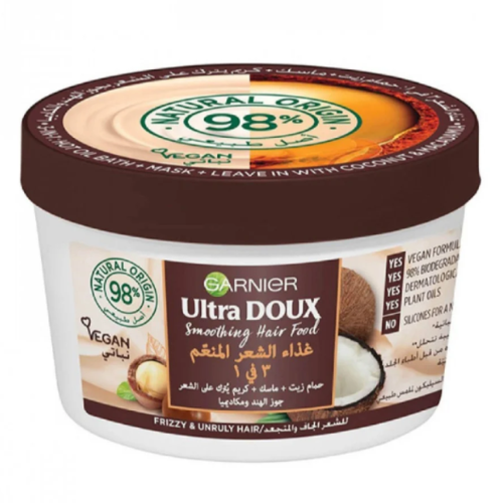 - هذا الخليط المنعم من جوز الهند والماكاديميا هو قناع معالج ومغذٍّ 3 في 1 للشعر المتجعد والعنيد
